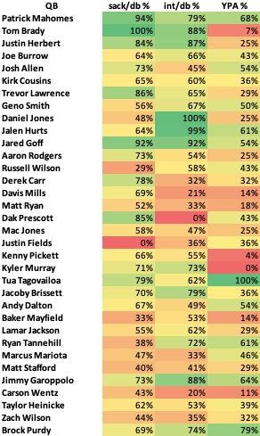 Illetve fontos kontextus lehet még, hogy van egy átalakulás a ligában, már ami a védelmek hozzáállását illeti a top QB-k irányába. A legjobb irányítók átlagos passzmélysége és a passzonkénti yardátlaga is lejjebb ment 2022-ben, ugyanis a védelmek arra kényszerítik őket, hogy sok rövid passzal haladjanak előre, elvéve a hosszabb játékok lehetőségét. A gyengébb irányítók ellen viszont nem (feltétlen) védekeznek így, tehát nekik relatíve magasabbak lettek ezek a számaik.