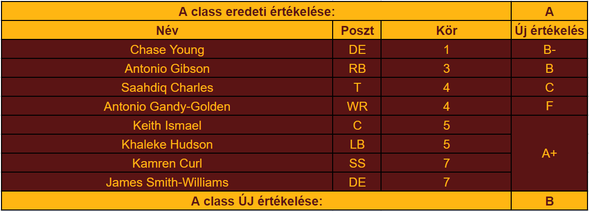Nyilván nem elvárás, hogy a sok hátsó körös játékosból stabil kezdőket húzzon egy csapat, de hogy a harmadik körtől kezdve nyolc játékosból egyetlen legalább átlagos szintűt se sikerüljön behúzni, az nevetségesen rossz arány. Ezzel együtt azért elégedettek lehetnek a Giantsnél, egy All-Pro kaliberű LT és egy átlagon felüli kezdő safety azért bőven jó, pláne ebben a classban. Értékelés: B-