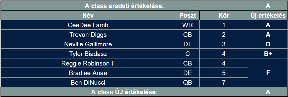 Összességében a Cowboys szerzett magának egy elit elkapót (ráadásul az Eagles orra elől), egy jó kezdő cornert és egy korrekt kezdő centert. Gallimore mellé ment és a hátsó körösök többségéből sem lett semmi, de ez még mindig nagyon jó arány, a liga többsége kérdés nélkül elcserélné a saját draft classát erre. Értékelés: A