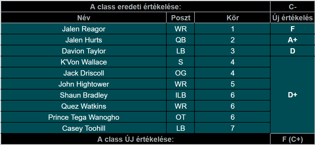 Összességében a draft mögött húzódó teljes elgondolás és koncepció teljes kudarc volt (Jefferson helyett Reagor az évtized legrosszabb döntése), amin mindössze az kozmetikázik némileg, hogy Hurtsöt két év alatt sem tudták sehogy sem lecserélni, hiába tett meg érte mindent Roseman. Ez így nálam nagyon sima karó, amit még Hurts sem tud jóra felhúzni. Értékelés: C+, ha csak az érkező játékosok hozzáadott értékét nézem (vagyis az egy szem Hurtsöt); F, ha a koncepciót.