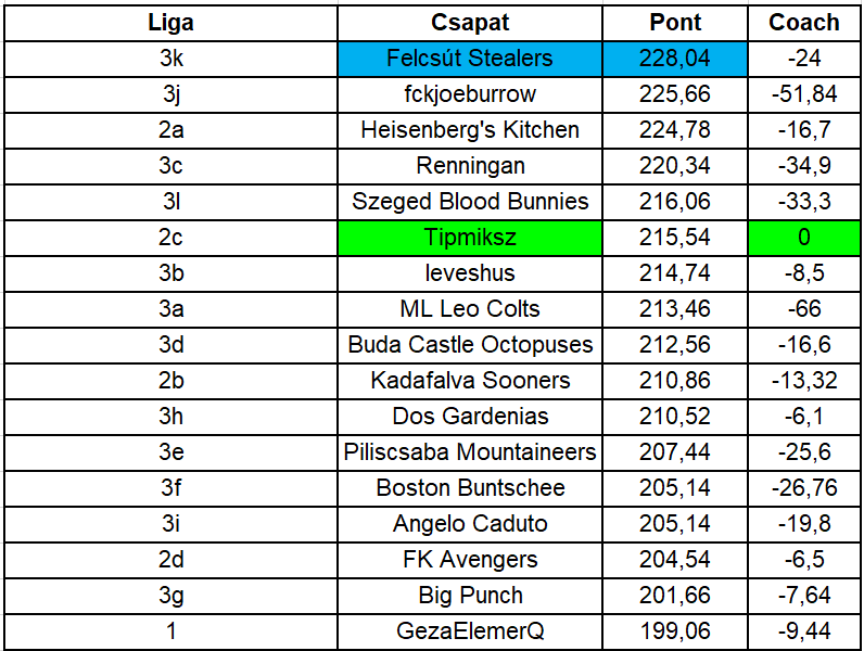 Majdnem minden liga nyertesének sikerült átlépni a 200+ pontos határt, nagyon komoly volt a verseny. A legjobbak legjobbja Felcsút Stealers lett, aki úgy szerezte a legtöbb pontot a héten, hogy 24 pontot ott hagyott padon (a második fckjoeburrow meg verheti a fejét a falba, mert úgy maradt le a győzelemről három ponttal, hogy 51,84 pontot hagyott a padon). A legjobb kezdőt pedig Tipmiksz rakta össze, konkrétan egyetlen pontot sem hagyott a padon, ráadásul pont ellenem lépett pályára (f*ck):