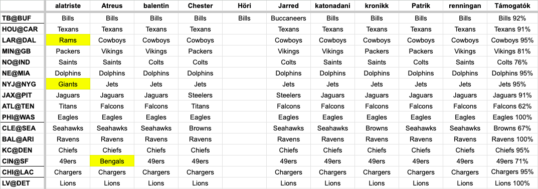 Ismét teljes forduló, azaz mindenki játszik a héten. Ne felejtsétek, hogy óraátállítás is lesz, úgyhogy minden egy órával hamarabb kezdődik! Lesz itt 1/1 vs. 1/2 harc, Bengals-49ers szuperrangadó, visszavágók, megjósolhatatlanok, minden ami kell!