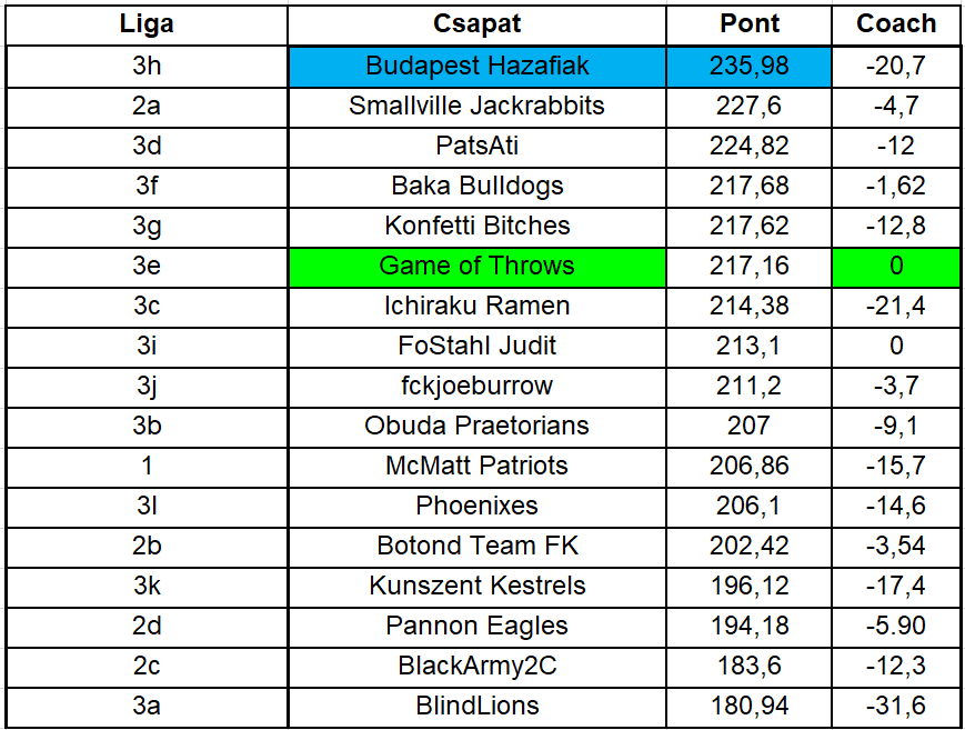 Ezúttal sem volt szoros a mezőny, Budapest Hazafiak relatíve magabiztosa húzta be a fordulót úgy, hogy még 20 pontot a padon is hagyott. Ráadásul a legnagyobb arányú győzelmet is ő aratta, de mivel egy héten egy játékos csak egy díjat vihet haza, így McMatt Patriots is örülhet, övé volt ugyanis a második legnagyobb arányú győzelem a héten. A fordulóban ráadásul ketten is tökéletes csapatot állítottak ki, de mivel Game of Throws több pontot szerzett, így ő viheti haza a kézműves sörpakkot.