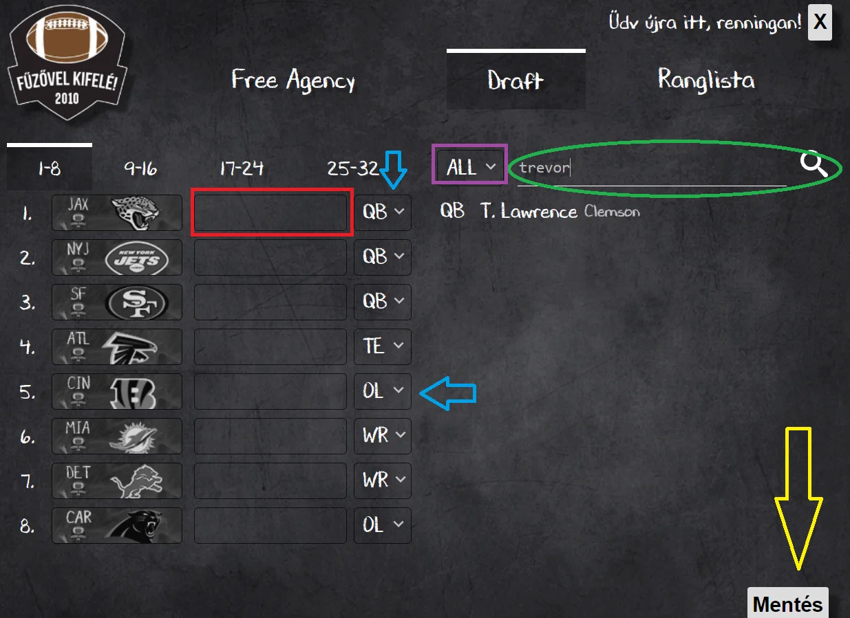• Csere nincs, tehát elsősorban csapathoz kell társítani a játékost, nem a draftpozícióhoz (nyilván a legtöbb esetben a kettő meg fog egyezni). Tehát ha úgy gondoljátok, hogy a Vikings fel fog cserélni a Cardinals helyére egy irányítóért, akkor a Vikingshoz írjátok a kiszemelt játékost.