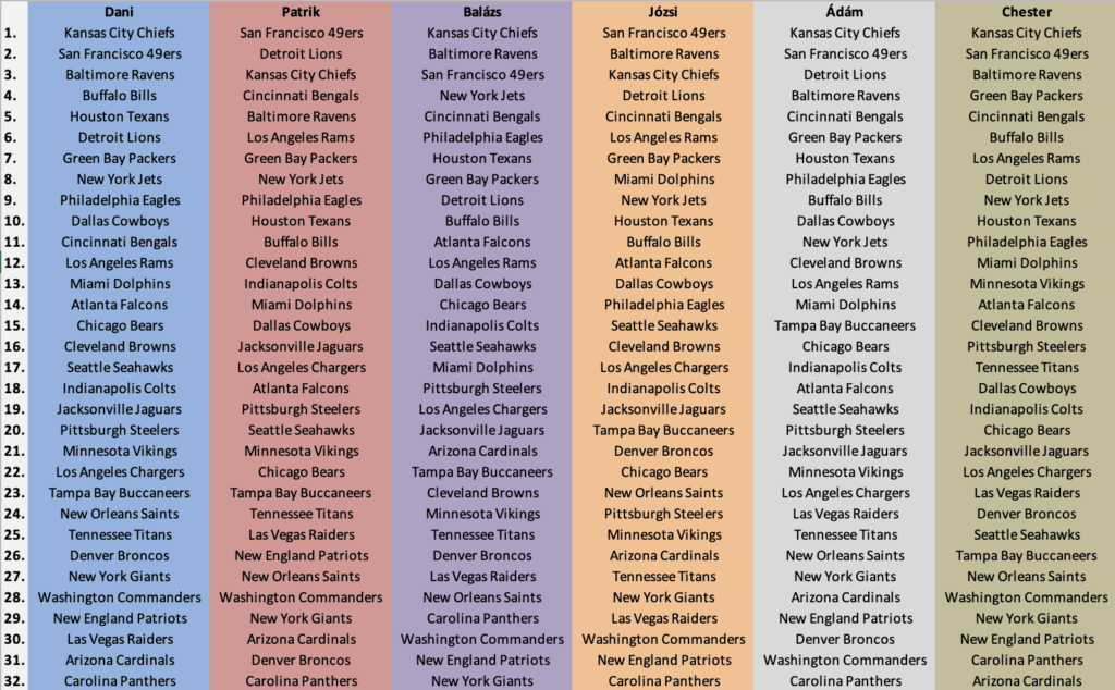 Következzen a lista utolsó darabja a nyolc legjobb csapattal. Ők a valódi Super Bowl esélyesek. A listát hat szerkesztő (Ádám, Balázs, Chester, Dani, Józsi, Patrik) állította össze, mindenki sorrendje ugyanolyan súllyal számított bele a rangsorba, a szélsőséges véleményeket nem vettük ki.