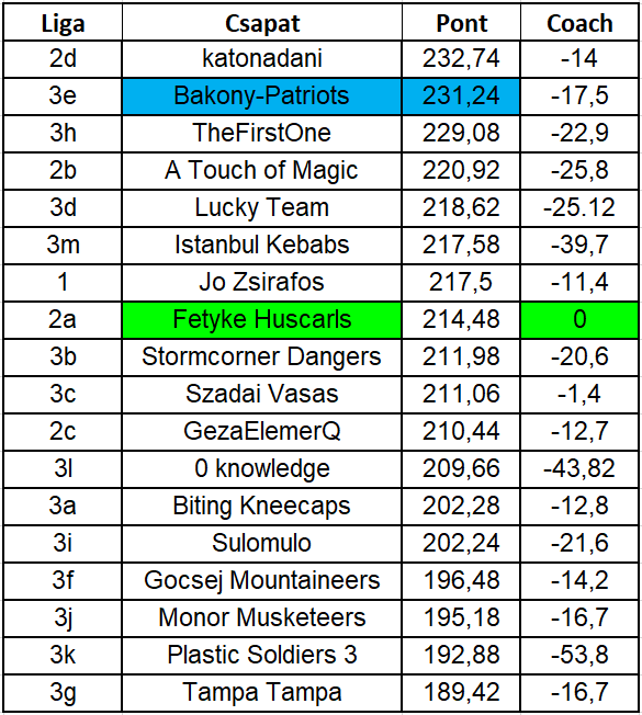 Katonadani teljesített a legjobban a fordulóban, de ő szerkesztőként nem vesz rész a játékban, így Bakony-Patriots húzta be hivatalosan a negyedik kört. A legjobb csapatot Fetyke rakta össze, konkrétan egyetlen pontot sem hagyott a padon.