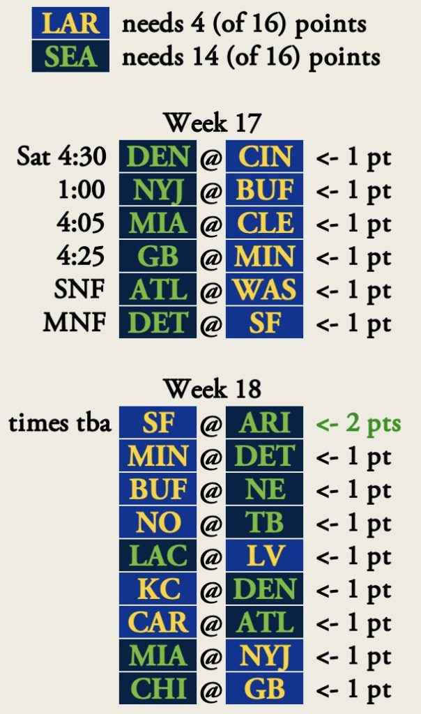 Ha viszont a Rams megveri a Cardinalst, akkor a Seahawksnak nem elég megverni a Bearst és utána a Ramst, segítségre is szüksége lesz másoktól. Ugyanis ha a Seahawks megnyeri ezt a két találkozót, akkor ugyanolyan mérleggel fognak állni, azonos lesz a csoporton belüli mérleg, a konferenciamérleg és a közös ellenfelek elleni mérleg is, így a “győzelmek erőssége” tiebreaker fog dönteni közöttük. Ebben a Rams áll jobban, de még nem biztos az előnye.