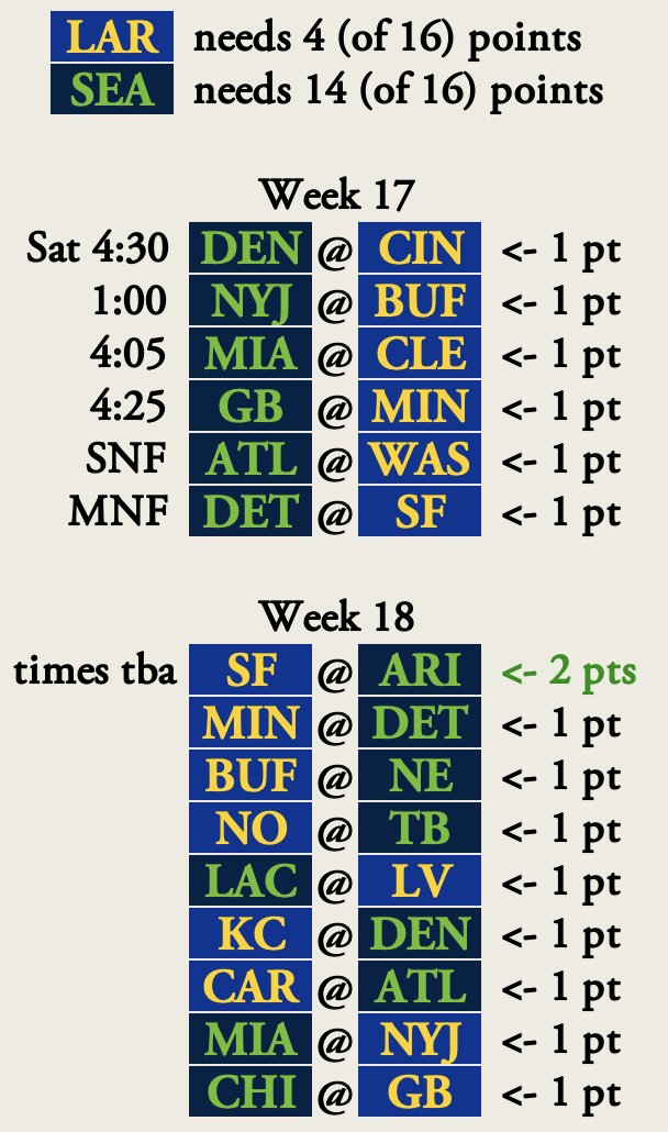 A legegyszerűbb variáció az, hogy ha a Rams kikap a Cardinalstól, akkor biztosan az utolsó fordulós egymás elleni dönt majd arról, ki jut be a playoffba (bármi is lesz a Seahawks-Bears meccsen).