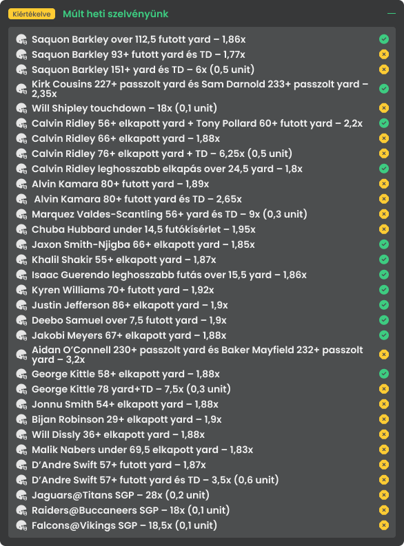Ez egy csúnya hét volt, személy szerint a legrosszabb fordulóm idén, bár Coin Tossban egy kicsit jobb volt a helyzet, mint magánban. Barkley már megint megállt az egy yardoson, hogy ne legyen TD, a Saints és a Titans csúnyán felsült a gyenge ellenfél ellen (tanulság: ne fogadjunk rossz támadósorokra), Dissly megsérült, Jonathon Brooks megsérült, Brock Bowers egyetlen targetet kapott az első félidőben, Jonnu Smith a hosszabbításig nem kapott labdát, Malik Nabers a legvégén garbage time-ban jött vissza az overre, a nagy Falcons SGP-hez pedig csak a Bijan elkapott yardok hiányoztak.