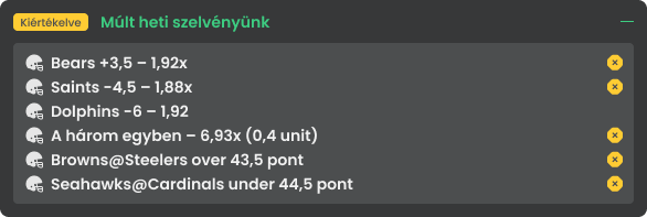 Három csapatnál is azt gondolom, hogy underdogként nyerni fog a héten, ebből kettőt mertem betenni ide (a harmadikat meg inkább teaserbe). A Texansban nem tudok bízni offense oldalon, a Dolphins támadósorának pedig szerintem elég nagy előnye van a gyors pálya közepi passzokkal és elkapás utáni yardokkal. A Chargersnél Herbert sérüléssel küzd, a védelem pedig az utóbbi időben kicsit visszaesett, és szerintem a Buccaneers offense elég jó ahhoz, hogy haladjon ellenük.