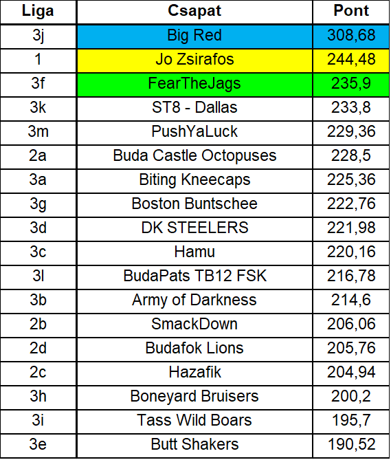 A héten Big Red teljesített a legjobban, ráadásul olyat tett, amire még soha nem volt példa. Az FK! Ligák történetében először ő szerzett 300+ pontot, ráadásul pont a PO-ban. Ezt nevezzük tökéletes formaidőzítésnek. A legnagyobb arányú győzelmet Jó Zsirafos érte el bő 109 ponttal, illetve úgy döntöttünk, hogy mivel már nincs coach lista, így az utolsó nyereményt a második legtöbb pontot gyűjtő játékos kapja. De mivel Jó Zsirafos már kapott egyet, így FearTheJags sem távozik üres kézzel.