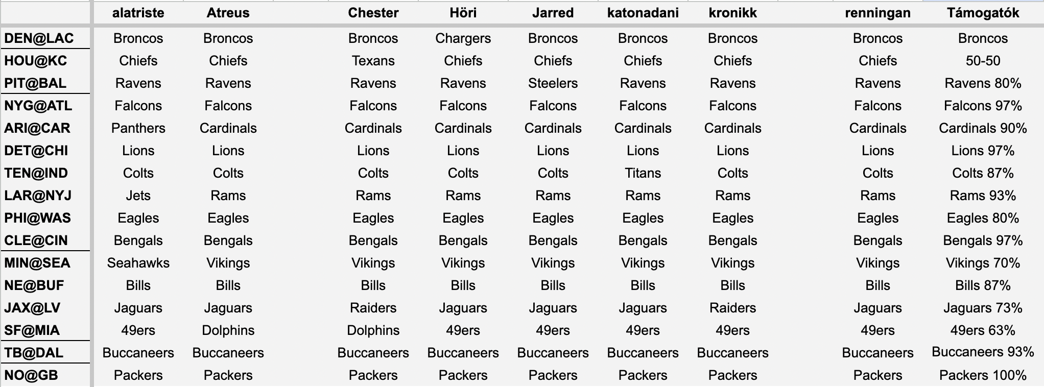 A Bills zsinórban 8 meccse szerez 30+ pontot, ami rekordbeállítás, most pedig meg is dönthetik a 2020-21-es Buccaneers csúcsát. Azonban mínusz 8 fok körül lesz a hőmérséklet, ami nem igazán kedvez a támadófocinak. Mondjuk a Patriotson így is át kéne tudniuk szaladni igazából, de ez talán egy kis kételyt ébreszthet bennük, hogy megint fel tudnak-e tenni 30 pontot és tudják-e hozni a 14 pontos spreadet. Benne van, hogy kicsit leeresztenek a Lions elleni eufórikus győzelem után, de egyelőre nem akarok ellenük fogadni.