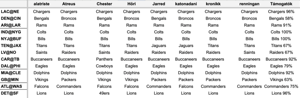Fű alatt érdekes mérkőzés kerekedett ebből. Egyrészt mert jelen állás szerint két playoff-csapatról van szó, és a Falconsnak nagyon fontos a győzelem (egy vereség esetén a Buccaneers beelőzheti és jövő héten ki is ütheti őket). Másrészt mert Michael Penix Jr. állt be Cousins helyére, így ugyan elvéve a bosszúmeccset a veterántól, de jobb játékkal megörvendeztetve a szurkolókat. A Commandersnek egyébként a 6. kiemelés még összejöhet, ha a Packers kikap a Vikingstól, ami ideális lenne. A győztes kilétében egyáltalán nem vagyok magabiztos, mert a Falcons most talán kicsit alulértékelt az irányítóváltással, és épp ezért úgy gondolom, hogy ez a spread túl magas.