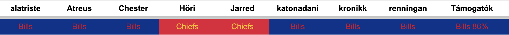 Nagyon szoros meccsre számítok és hosszú drive-okra. Így pedig kevés lehetősége lesz pontot szerezni a csapatoknak, amiket kíméletlenül ki kell használni. Egyetlen labdaeladás is dönthet, márpedig mindkettő csapat szenzációs ebben a tekintetben. A Chiefs a legutóbbi 7 meccsén nem adta el a labdát, a Bills pedig az egész eddigi szezont nézve a liga legjobb csapata. Összességében kiszámíthatatlan a meccs, de mindent egybevetve a Bills tűnik stabilabb, erősebb csapatnak, így Josh Allenék győzelmére fogadnék.