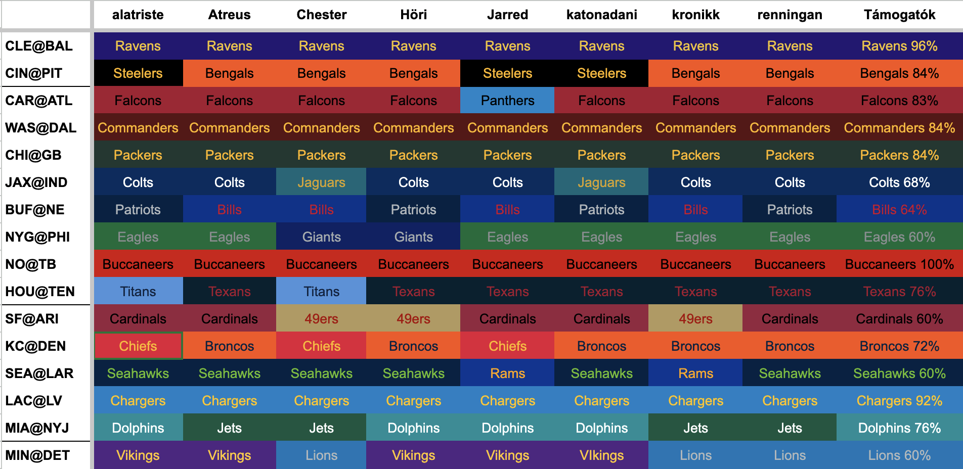 Ha a Broncos mégsem nyerne, akkor a Dolphins bejuthatna a rájátszásba. Ugyanakkor nem Tua Tagovailoával, hanem Tyler Huntley-val vágnak neki az utolsó körnek, ami nem segíti az esélyeiket. A Jets meg abszolút kiszámíthatatlan, lehet Rodgers utolsó meccse jön, de ki tudja jelent-e ez nekik bármit is. Legyen Dolphins, de nem magabiztosan.