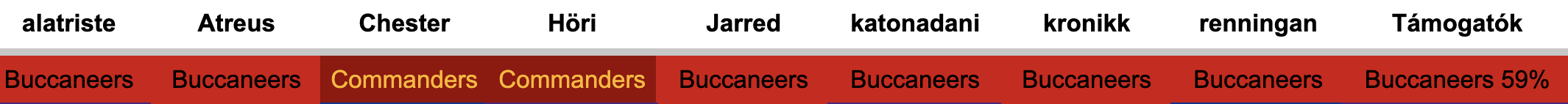 Ami a tényleges passzjátékot illeti, amikor Daniels elindítja a labdát, itt előnyben lesz a Commanders. Nem valami erős az elkapósor, így az emberezés jó taktika szokott lenni ellenük, csak hát a Buccaneers nem tud emberezni, mert nincsenek meg a játékosai, így a blitzek mögött is szinte végig zónáznak. A playoff csapatok közül konkrétan a legkevesebbet emberezték az alapszakaszban, és nem is várom, hogy ez másképp legyen most. Így Terry McLaurin, Olamide Zaccheaus és Zach Ertz is hasznos fegyver lehet, sőt Austin Ekeler is a backfieldről indulva.