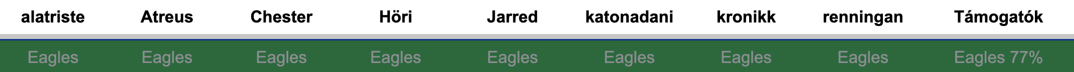 Összességében azt gondolom, hogy tehetségfölényben van az Eagles, de ezt valamennyire tudja kompenzálni rendszerből a Packers defense, amely egyébként a 7. legjobb volt a szezonban DVOA szerint – a Sasok csak egy erősebb ellenféllel találkoztak idén. És mivel kevés elkapás utáni yardot (3.) és kevés 20+ yardos játék (2.) engednek, így passzjátékban nem feltétlen lesz egyszerű dolga a Sasoknak.