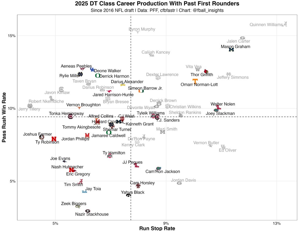 Ritkán, tényleg csak a prémium tehetségeknél mondható el, hogy mindkét területen hasonlóan jó – kiemelkedő egy prospect. Graham azonban ilyen. A 2024-es szezonban a draftra jelentkező játékosokból neki a legjobb a pass rush win rate-je (14%) és neki a legjobb a run stop rate-je (11,5%). Alább egy remek kis kimutatás, hogy mennyire is domináns a saját classában és a korábbi classokhoz képest. Csak Quinnen Williams és Jalen Carter tudtak összességében kiemelkedőbb teljesítményt letenni az asztalra az elmúlt 9 év első körös védőfalemberei közül – illusztris társaság.