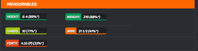 McMillan egy dologban emelkedik ki nagyon a class tetejéről a posztján. Ez pedig az, amit egyáltalán nem lehet másolni vagy utánozni. A testi adottságok. Az emberek nagy része amikor tipikus WR1-et szeretne, akkor egy magas, fizikális, erős játékosról álmodik (azt most engedjük el, hogy manapság már nem feltétlenül csak ilyen elsőszámú elkapók vannak). A volt Arizona elkapó pedig maximálisan teljesíti az elvárt fizikai paramétereket. Közel 195 centiméter (felső 11%) és 219 fontot nyom, azaz közel 100 kilót (felső 12%). Ezek nagyjából Tee Higgins vagy Drake London számai.