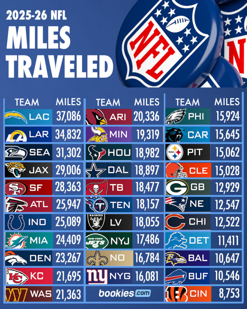 A Chargers konkrétan rekordot dönt a 37.086 mérföldjével, azaz 59.684 kilométerével. Hatszor utaznak a keleti partra, egyszer pedig Brazíliába, így jön ki a megtett táv, amivel egyébként 42 időzónát utaznak át a szezon során. A spektrum másik végén a Bengals van 8.753 mérfölddel, azaz 14.086 kilométerrel. Ez kevesebb mint a Chargers által megteendő távolság negyede. A leghosszabb túrájuk Denverbe vezet.