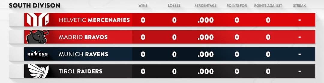A North divízióban három tradicionálisan erős német csapat mellett egy új dán franchise szerepel majd, amely a 2025-ös szezonban debütál. A csoporton belüli erőviszonyokat alaposan átrendezheti az átigazolási időszak, mivel több kulcsjátékos, köztük korábbi MVP-k is csapatot váltottak a divízión belül, ami várhatóan különösen izgalmassá és feszültté teszi az egymás elleni mérkőzéseket. Az előzetes power rankingek alapján a csoport két főszereplője a regnáló bajnok Rhein Fire és az újonc Nordic Storm, akik a szezon során várhatóan komoly vetélytársai lesznek egymásnak. Ugyanakkor véleményem szerint ez a divízió meglehetősen alul van becsülve, és bár való igaz, hogy a csoportban szereplő másik két német csapat jelenleg inkább egy újjáépítési fázisban van, ennek ellenére okozhatnak kellemetlen meglepetéseket ellenfeleik számára.