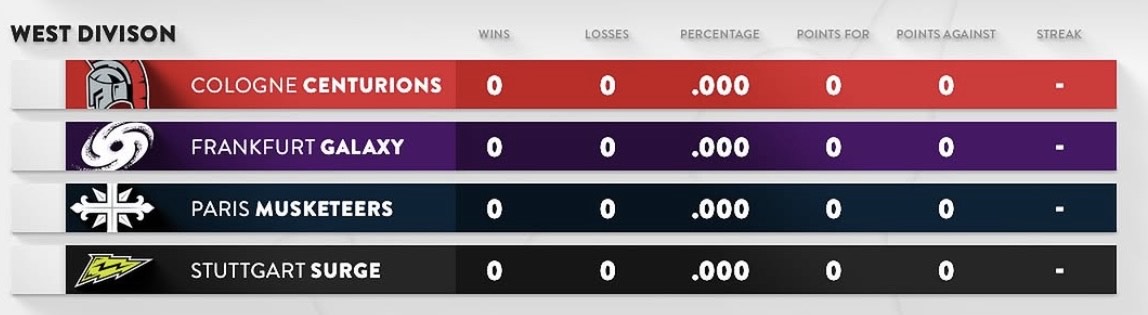 A West divízió felépítésénél is a liga igyekezett megőrizni a már korábban formálódó rivalizálásokat, hiszen a négy csapatból három a korábbi “Western Conference”-ből érkezik. Ehhez a trióhoz csatlakozik idén a Stuttgart Surge, amely tavaly második kiemeltként egészen az elődöntőig menetelt, és idén is komoly célokkal vág neki a szezonnak. A divízió első helyéért folytatott harcban az egyedüli komoly kihívójuknak a Paris Musketeers ígérkezik. A másik két csapat inkább a középmezőnyben küzdhet meg egymással, de a divízión belüli találkozók így is bővelkedhetnek izgalmas és fordulatos párharcokban.