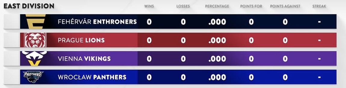 A szezonnyitó mérkőzésre pedig ma, május 17-én kerül sor 18:00-kor, ahol a címvédő Rhein Fire csap össze a tavalyi elődöntős Paris Musketeers csapatával. Illetve ezzel párhuzamosan rendeznek egy East divíziós csopormérkőzés, a Wroclaw Panthers és a Fehérvár Enthroners ütközik meg egymással.