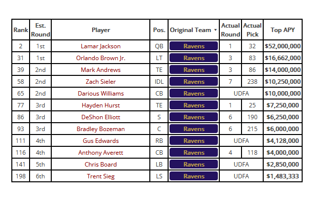 1/25-re a tight end Hayden Hurtsöt választották, aki annyira nem vált be, már öt csapatban megfordult. Utána viszont felcseréltek 1/32-re Lamar Jacksonért, aki mindenért kárpótolta őket, és értelemszerűen az évi $52 milliós fizetésével meg is dobja a draft átlagát.