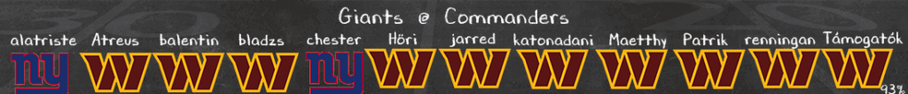 A Giants offense-zel kapcsolatban jóval több a kérdés, még úgyis, hogy mind Russell Wilson, mind az újonc Jaxson Dart jól mutatott az előszezonban. Az előbbi kapta meg az offense-t (legalábbis így szezon elejére biztosan), de azt nem mondhatjuk, hogy optimális körülmények közé került volna. A támadófal az egyik leggyengébb a ligában, és a skill playerek közül is csak az elit elkapót Malik Naberst, valamint a tavaly általánosan jó teljesítménnyel a ligába érkező Tyrone Tracyt lehet kiemelni, mindenki mástól még várjuk az áttörést, vagy legalábbis a korrekt munkát. Szerencséjükre a Commanders defense is sok helyen támadható, passzsiettetése nem tudom, hogyan lesz a csapatnak, és a passzvédekezéssel kapcsolatban is több a kérdés, mint a stabil pont, legyen szó akár a már öregedő Marshon Lattimore-ról, akár a szerény safety sorról.