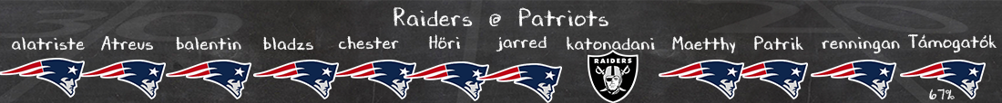 A túloldalon Geno Smith-nek egy fokkal nehezebb dolga lesz azért, mert egyrészt nincs tele az elkapó szoba biztosnak mondható targetekkel (Jakobi Meyers mellett kb csak újoncok állnak a rendelkezésre), másrészt a Patriots secondaryben Carlton Davis fogja vadászni a labdákat, a másik szélen viszont nem Christian Gonzalez fog kezdeni, ő ugyanis egy combhajlító sérülés miatt kihagyja ezt a meccset. Amiben viszont bízhat, hogy egy meglepően stabil támadófal mögé állhat be osztogatni, és hogy Brock Bowers elit TE mellett most már egy elit(nek várt) futó, Ashton Jeanty is segíthet mozgatni a láncokat (ami üde színfolt lehet a tavalyi, szintén ligaalja futó teljesítményhez képest). És itt jó helyzetben is lehetnek, a Patriots védőfallal kapcsolatban még úgyis sok a kérdőjel (legyen szó futásmegállításról, vagy siettetésről), hogy a nyáron megfizették a DT Milton Williamst – nem lehet kijelenteni, hogy egyértelműen jobb lesz majd ez az egység, mint az előző szezonban, amikor is a ligában a legkevesebb meccsenkénti átlagos sacket szerezték.