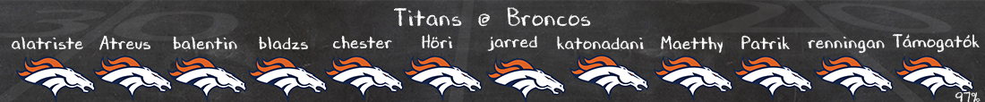 Talán ez lesz a forduló legegyértelműbb mérkőzése, a tavalyi 1/1-es, új irányítóval felálló Titans játszik a playoff részvétel után még tovább erősödő Broncos ellen. Nincs is ezzel semmi baj, egészen más célokkal vág neki a két gárda az idénynek, Tennesseben minden Cam Wardról szól, csak sokadlagos, hogy milyen eredménnyel zárják majd a szezont, Ward mutassa meg, hogy ő a jövő Nashville-ben. Ezzel szemben Denverben ismét a rájátszás a kötelező minimum és a feladat minél közelebb kerülni a Super Bowlhoz.