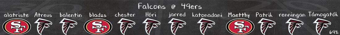 A vendégek támadósorában Jake Matthews OT és Darnell Mooney WR egészsége a kérdéses, ha Matthews nem játszik az azért adhat egy nagyobb pofont az amúgy korrekt támadófalnak. Ennek ellenére, ha máshol nem, a földön biztos, hogy fog haladni a labda; az amúgy sem erős 49ers védelemből most már Fred Warner is kiesett, így Bijan Robinson minden egyes labdaérintése sok yarddal és rengeteg potenciális ponttal kecsegtet majd. Penix azért nincs csúcsformában, Drake Londonon és Kyle Pittsen kívül az Atlanta sem tobzódik célpontokban, így ha a San Francisco le tudja lassítani Robinsont (és ez egy hatalmas „ha”), akkor azért bőven megnőnek a hazaiak esélyei a győzelemre.