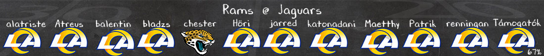 A Jaguars támadósorból csak Brenton Strange esett ki, ezzel együtt sem lesz könnyű dolguk a Rams védelme ellen. Amúgy sem túl fényes Trevor Lawrence eddigi szezonja, az LA coverage ellen pedig még nehezebb lesz majd javítania, nagy szükség lenne most (is) Brian Thomas tavalyi formájára. A futás az, ami eddig nagyon működött Etienne vezetésével, de a Rams védelem remek idén a földön is, valamint a liga egyik legjobb védőfala jelentős előnyben kell hogy legyen a Jaguars közepes támadófalával szemben; ezzel még nehezebb helyzetbe kerülhet majd Lawrence. Kevés pontra számítok, védelmi dominanciával, a fő kérdés majd Nacua helyettesítése lesz, ennek eredményességén dőlhet el a párharc kimenetele is.