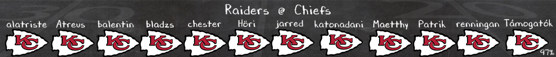 AFC West házirangadó, ellentétes előjelekkel. Gyenge ez a Raiders offense, ráadásul Brock Bowers továbbra sem tudott edzésbe állni, és most Jakobi Meyers játéka is kérdéses. Sok szerepet kaphat így Ashton Jeanty, ami jól is állhat neki a Chiefs akadozó futásvédekezése ellen. Rajta kívül Tre Tuckernek és az újonc elkapóknak kellene fellépnie, na meg Geno Smithnek, ezek lesznek a nehezebb feladatok a Chiefs korrekt coverage védelme ellen. A fő kérdés leginkább a nem erős OL és a nem elit Kansas pass rush csatája lesz, ennek a kimenetele adhat még egy izgalmas színt a meccsnek.