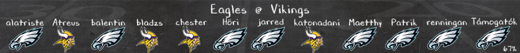 A Philly offense oldalán megint hatalmas válság meetingek voltak, ahol el lett mondva, hogy most majd minden jó lesz, de ettől még komoly gondok vannak a sztárokkal tűzdelt rosterrel. Ráadásul most Flores csodavédelmével fognak találkozni, akik imádnak Cover 2-t (két mély safety) játszani, ami ellen Hurts eddig borzalmas volt, így nem valószínű, hogy pont most tud majd robbanni az Eagles passzjáték. Aminek viszont ideje lenne működnie, az a futójáték, a Vikings front ellen lehet ugyan futni; bár eddig Barkley és a csak papíron remek OL nem mutatott semmit se magából ezen a téren. Nem várok sok pontot, de ahhoz tartom magam, hogy a Vikings irányító teljesítménye döntheti majd el ezt a találkozót.