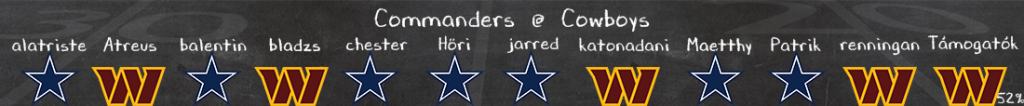 Mint ahogy Jayden Danielsnek sem kéne, hogy gondot okozzon a liga legrosszabb védelme. Ez a Cowboys D ugyanis pocsék, semmi sem működik náluk, főleg futás ellen gyalázatosak, és nem kizárt, hogy Croskey-Merrittel erre fog majd építeni a Commanders, Terry McLaurin és Deebo Samuel ugyanis továbbra is sérült, előbbi nem játszik, utóbbi erősen kérdőjeles, így azért eléggé megcsappantak az elérhető célpontok Daniels számára. Ahol esetleg lehet keresnivalója a Cowboys védelemnek, az a pass rush, ez az egyetlen terület, ahol nem borzalmas a védelmük, a fővárosiak fala (főleg középen) azért bőven sebezhető. Itt látom a meccs legfontosabb kérdéseit is, hogy ezen a várhatóan sok pontos találkozón melyik nem túl acélos védelem tudja majd jobban lassítani a másik csapat remek támadósorát.