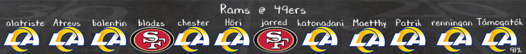 Maradjunk is az NFC nyugati felén, egy kaliforniai rangadóval folytassuk az esténket, ahol ráadásul a vendégeket a bosszú tüze is hajthatja. A Ramsnél minden adott, az egyik legerősebb offense-t vezeti Matt Stafford, a levegőben abszolút elit a csapat, és a futójátékra sem lehet panasz – az egyetlen dolog, amibe még mindig bele lehet kötni, az a passzblokkolás, de itt is javulnak. Nem igazán lehet várni, hogy majd ellenállást tud kifejteni a 49ers védelme, vannak ugyan sérültjeik, akik már visszatértek limitáltan edzeni, de még velük együtt is nincs olyan párharc, ahol őket hoznám ki erősebbnek. De, ne felejtsük el, ugyanezt hittük az odavágó előtt is.
