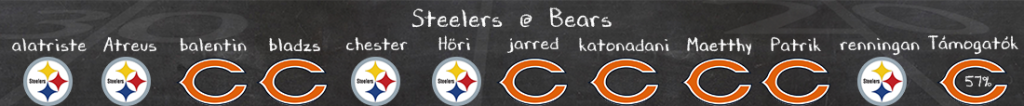 Már csak azért is kellhet a támogatás, mert Aaron Rodgers játéka kérdéses egy csuklósérülés miatt – ha ő nincs, Mason Rudolph kezd. Ami nem hangzik jól, de szerencséjükre pont a Bears az ellenfél, akiknek a védelme botrány, főleg a védőfal ritka gyenge, így sok siettetésre ne számítsunk, Jaylen Warren futásaira már annál inkább. Ami pozitívum a hazaiknál, hogy mind a három kezdő corner (Johnson, Stevenson, Gordon) edzett már a héten, játékukra várhatóan számíthat már a Chicago, és Metcalf levédekezésénél minden segítségre szükség lesz. Sok múlik majd azon, lesz-e Rodgers vagy sem, de még vele együtt is benne van, hogy a jó formában lévő Chicago otthon tartja a győzelmet.