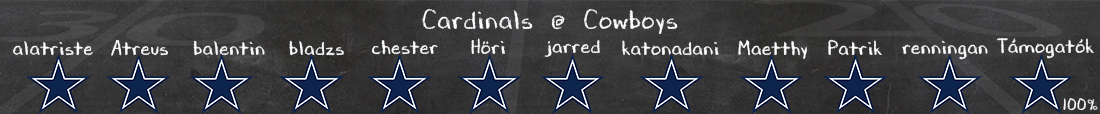 Sokkal érdekesebb lesz a labda másik oldala, Kyler Murray visszatérése úgy néz ki, még várat magára, Brissett tűnik a befutónak. Amúgy rajta kívül a már rég sérült futókon kívül más hiányzó nem várható a támadósorban. Kérdés már csak az, mire lesznek képesek – mert a Cowboys védelem ellen nagyjából bárki össze tud hozni egy jó meccset. Nincs olyan pont ebben a defense-ben, amit ne lehetne kihasználni; főleg futás ellen rosszak, és akkor itt jön elő a nagy kérdés, ki fog futni a Cardinalsban? Maradnak-e Bam Knightnál, visszatér-e Trey Benson, vagy egyéb? Sok múlhat ezen. Levegőben is sebezhetőek, itt meg Brissette-n fog majd sok múlni, és inkább ettől tartok. Lehet sok pont a meccsen, de így se úgy se látom, hogy az Arizona tudja majd tartani a lépést Prescott-tal.