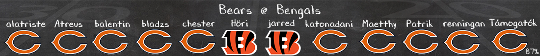 Mind a két csapatnak ugyanaz a monogramja, és nem csak ebben hasonlítanak, hanem például a sok sérült kezdőben is. A Bengalsnál nincs jól Flacco, így lehet megint Browning kezd majd, ami nem sok jóval kecsegtet. Mert amíg Flaccoval végre mozgott az offense, el tudták fedni a támadófal gyengeségeit, és a sztár elkapókon kívül a futás is működött, addig Browninggal nagy eséllyel az első 5 meccs borzalmát kapnánk. Pedig a Bears védelem ellen pont lenne esély haladni, megmutatta ezt a Huntley-val felálló Ravens offense is, ráadásul főleg a secondary lesz sebezhető, szinte minden kezdő hiányzik onnan, így ez jó esély lenne Higginsnek és Chase-nek villantania valamit.