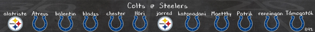 Jobban néz ki a Steelers offense, az elmúlt meccsek vereségei nem miattuk voltak. Rodgers javul, de vele együtt jobban mutat a támadófal, az elkapók és a futójáték is – nem vártam volna, hogy a szezon felénél azt kell, hogy mondjam, a támadók tartják a védelmet a víz fölött Pittsburghben. Márpedig a Colts D közel sem olyan betonbiztos, mint az offense, Ward még mindig hiányzik a secondaryből, Latun kívül nem nagyon van pass rush: látom, hogy Rodgersék tudnak majd haladni mind földön, mind levegőben (ráadásul a remek DT Grover Stewart sem edzett még a héten). Sok fog múlni a védelmeken, mert amúgy látok egy pontgazdagabb meccset. Viszont nagyon nehéz nem az Indy támadókkal menni, amíg ilyen szinten pörög ez az offense.