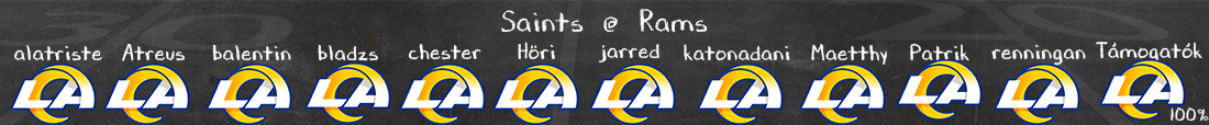 Az amúgy oké Saints offense tulajdonképpen kapitulált a Tampa nem világrengető védelme ellen, mi lesz most akkor a remek Rams ellen? Rattler le lett ültetve, Shough fog kezdeni, és brutális mélyvíz lesz ez a meccs. A közepes támadófalat gond nélkül fogja szétszedni a Rams pass rush, nem kizárt, hogy Shough többet látja majd Verse-t meg Youngot, mint a saját célpontjait. Kamara még mindig jól fut, de a Rams a földön is jól fogja a labdát, és várhatóan Shough megzavarása mellett a futásmegállítás lesz a prioritás, így itt sem várok sok mozgást. Az egyetlen érdekes dolog egy teljes kezdő meccses Shough lesz (még úgyis, hogy sok pozitívumot nem várok tőle), minden más arról fog szólni, mekkora különbséggel nyer majd a Rams.