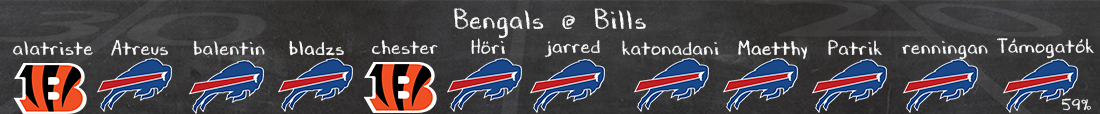 6 éve nyert utoljára a Bills a Bengals ellen, vajon most sikerül nekik újra? A Steelers ellen végre láthattunk valamit abból a Buffalóból, amit ismerünk: ugyan Josh Allennek nem volt egy kifejezetten jó meccse, de nem volt nagy hibája, az elkapói pont annyit szerepeltek, mint amire szükség volt, a futójáték meg remekül üzemelt Cookkal. Ez lesz innentől is a kötelező minimum, ha bármit is akarnak a rájátszásban (meg persze előbb be kell jutni oda), de ezzel együtt többre van szükség a passzjáték részéről. A Bengals defense ugyan megrázta magát az elmúlt két meccsen, de még így is a liga egyik legrosszabb védelméről beszélhetünk – ha sikerül is átmenteni a jobb formát, akkor sem lenne szabad, hogy Allen és támadói ne tudjanak ellenük nagy megerőltetés nélkül pontokat felpakolni.