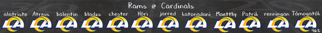 Meglepetés vereséggel érkezik a Rams a sivatagba egy csoportmeccsre. Stafford ugyan felsült a Panthers ellen, de várakozásaim szerint több ilyen nem lesz a szezonban, újra az MVP formáját fogjuk majd innentől látni. Mint ahogy a támadósortól sem számítok túl sok negatívumra a Cardinals védelme ellen, hiszen nem rossz ez a defense, de nem kellene, hogy elegek legyenek a Rams offense lelassítására. Közepes futásvédelem, közepes passzvédelem, gyenge pass rush – mindezekkel szemben egy korrekt támadófal, remek futójáték és kiemelkedő passzjáték. Ráadásul biztos, hogy a Rams támadók javítani akarnak a múltheti fiaskó után, Stafford labdái repülni fognak Nacua és Adams felé, Williams és Corum pedig lábon lohol majd át ezen a run defense-en, csak hogy maguknak is bizonyítsák, az ott egy hete csak egy botlás volt.