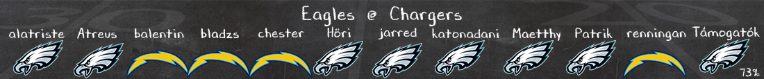Nem minden tökéletes az LA támadóknál sem, az egy dolog, hogy támadófal továbbra sem nagyon van, még mindig a cserék cseréi játszanak, de most Herbert is küzd egy komolyabb sérüléssel (egy töréssel, ami műtétet is igényelt), így játéka kérdéses. Az irányító tervez játszani, de majd meglátjuk, hogy ő, vagy Trey Lance osztogat-e az amúgy remek elkapó felhozatalnak. A támadófaltól függetlenül jól működik a futás is, Kimani Vidal jól helyettesíti Omarion Hamptont, aki viszont elvileg erre a meccsre már visszatér. És akkor kérdés, hogy milyen Eagles védelmet látunk majd? Annyira nem mehet rosszul még egyszer a futás védekezés, mint egy hete. És a pass rushnak is előnyben kellene lennie a Chargers támadófallal szemben (még Jalen Carter nélkül is, akit meg kellett műteni). Fontos lesz a falak csatája, fontos lesz Herbert egészsége; nem kizárt, hogy nagyon közel lesz egymáshoz ez a két csapat. Zárásnak újabb PO matek: Eagles nyer 98%, veszít 87%, Chargers 75% és 46%.