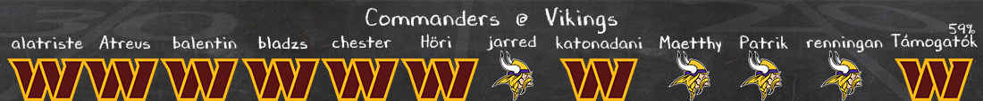 Visszajön McCarthy is a hazai offense-be, és Brosmer teljesítménye után erre hatalmas szükség is lesz, mert hogy nála csak jobb lehet a Vikings eddig szerény, elsőkörös reménysége. Már csak azért is, mert a Commanders védelme a legrosszabbak között van a ligában, főleg passz ellen vannak teljesen elveszve, szóval jó lehetőség lesz ez McCarthynak, hogy egy kissé végre bizonyítsa, volt értelme elköteleződni mellette. Nagyobb kérdés, hogy fog majd helytállni a Minnesota támadófala: a teljes baloldal sérüléssel küzd, és ugyan a Washington futás ellen is rossz, de meglepően korrekt pass rush-sal bír, ami még okozhat McCarthynak gondot. Ezzel együtt is, ha csak egy korrekt szinten fel tud lépni a hazai védelem Daniels ellen, már behúzhatja ezt a meccset a Vikings.