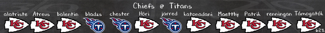 Fura ezt leírni, de érkezik egy újabb tét nélküli mérkőzés. A Kansas elvesztette Mahomest, és lőttek az idei rájátszásuknak is – ha nem is vár rájuk újjáépülés a holtszezonban, fontos és nehéz döntéseket kell majd meghozniuk. Gardner Minshew érkezik majd a kezdőbe a szezon hátralévő meccseire, és a moráltól függetlenül nem túl ideálisak a körülmények. A támadófal teljesen elfogyott előle, futójáték nem létezett Missouriban idén, de legalább korrekt elkapók megmaradtak, akiknek, ha lesz kedvük játszani tud majd haladni a támadósor (bár se Rice se Thornton nem edzett még a héten). Főleg a Titans védelme ellen, akik futás ellen jól néznek ki (csak ugye futni nem fog majd a Kansas), coverage-ben és pass rushban viszont gyengék – ezt mind kedvezhet ennek a szárnyaszegett Chiefs offense-nek.
