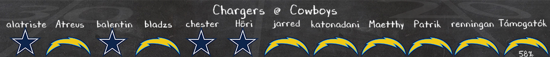 A Cowboys ekkor már tudni fogja, hogy van-e még halovány esélye a rájátszásra; ha nyer a Philly szombat este, akkor vége is a dalnak Texasban. Lehet, hogy már amúgy is ez a fásultság érződik rajtuk egy ideje; az amúgy ezer fokon égő támadósor nem volt képes igazán meccsben maradni se a Lions, se a Vikings ellen. Prescott továbbra sem rossz, Lamb és Williams is jól néz ki (előbbi viszont most betegséggel küzd), de a támadófal Guyton hiányában szenved, és Pickens is visszaszürkült a semmilyen szintre az OPOY közeli első féléve után. És érkezik ellenük egy top5 védelem, mind földön, de főleg levegőben kiváló a Chargers defense, ahol még a pass rush is magára talált; méltó ellenfelei lennének a legjobb formában lévő Cowboys offense-nek is. De így, hogy már nem égnek Prescotték ezer fokon, nem feltétlen számítok majd sok pontra, és hiába a gyenge LA OL, fog annyit haladni a Chargers offense, hogy több pontot szerezve lényegében már a januárra készülhessenek Herberték.