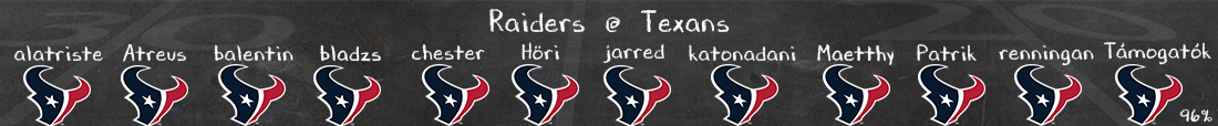 A forduló legsimább mérkőzése maradt már csak hátra a 10 órás sávból. A Raiders támadósor romokban, hiába tér vissza Geno Smith, nem számíthatunk semmi jóra néhány kósza Bowers elkapáson kívül, nincs egyéb célpont, gyenge a fal, nem megy a futójáték. Senki ellen sem, nem hogy a liga legjobb védelme ellen; ugyan a Philly defense se rossz, de ha nekik sikerült lenullázni a Raiders támadóit, akkor a Texans védelmétől nagyjából a negatív mennyiségű pont lenne az elvárás a Vegasszal szemben.