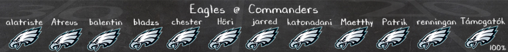 Jayden Daniels nem tér már vissza idén a Commanders offense-be, ezzel együtt Mariota sem vezeti rosszul ezt a támadósort. Egy több, mint oké támadófal (ahonnan most Tunsil hiányozni fog), jó futójáték és korrekt elkapó páros segíti őt ebben. Zach Ertz hiánya azért érezhető, de McLaurin és Deebo Samuel tudja hozni az előzetesen elvárt szintet, a kisebb nevekből álló futó trió pedig jól mozgatja a labdát a földön. Nem lesz most ezzel együtt sem könnyű dolguk, az Eagles defense kopogtat a top5 védelmek ajtaján passz és futás ellen is, még Jalen Carter hiányában sem lehet más az elvárás, mint hogy le tudják lassítani Mariotáékat. Csoportmeccsen mindig történhet meglepetés, a Philly viszont egy győzelemre van attól, hogy idén is megnyerje a divíziót, így meglepetés lenne, ha kiengednék ezt a meccset a kezük közül.